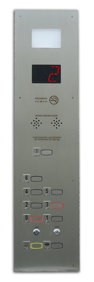 BT003 Botoeira de cabine com botão MX tim AL, PO, T, 1, 2, Braille, interfone, interruptor (luz), Yalle (liga/desl) e janela para IPD 50mm + botoeira de pavimento