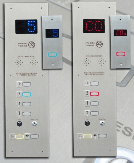 BT003 Botoeira de cabine com botão MX tim AL, PO, T, 1, 2, Braille, interfone, interruptor (luz), Yalle (liga/desl) e janela para IPD 50mm + botoeira de pavimento