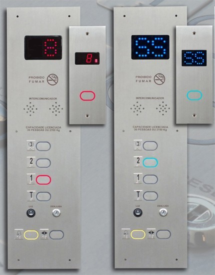 BT004 Botoeira de cabine com botão MX oblongo AL, PO, T, 1, 2, Braille, interfone, interruptor (luz), Yalle (liga/desl) e janela para IPD 50mm + botoeira de pavimento